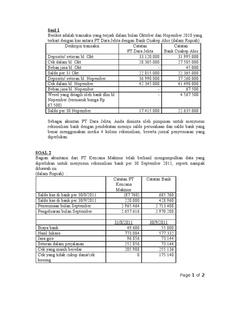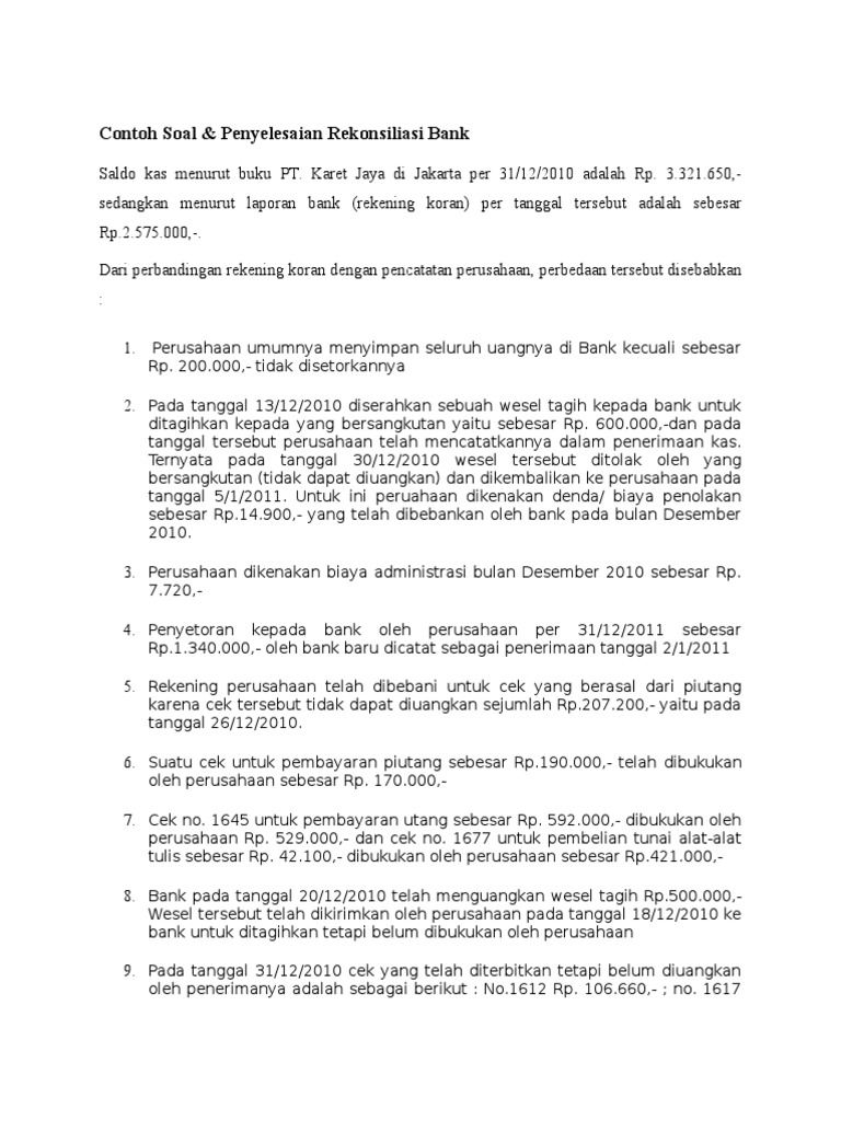 Contoh Soal Rekonsiliasi Bank Dan Jawabannya Contoh Soal